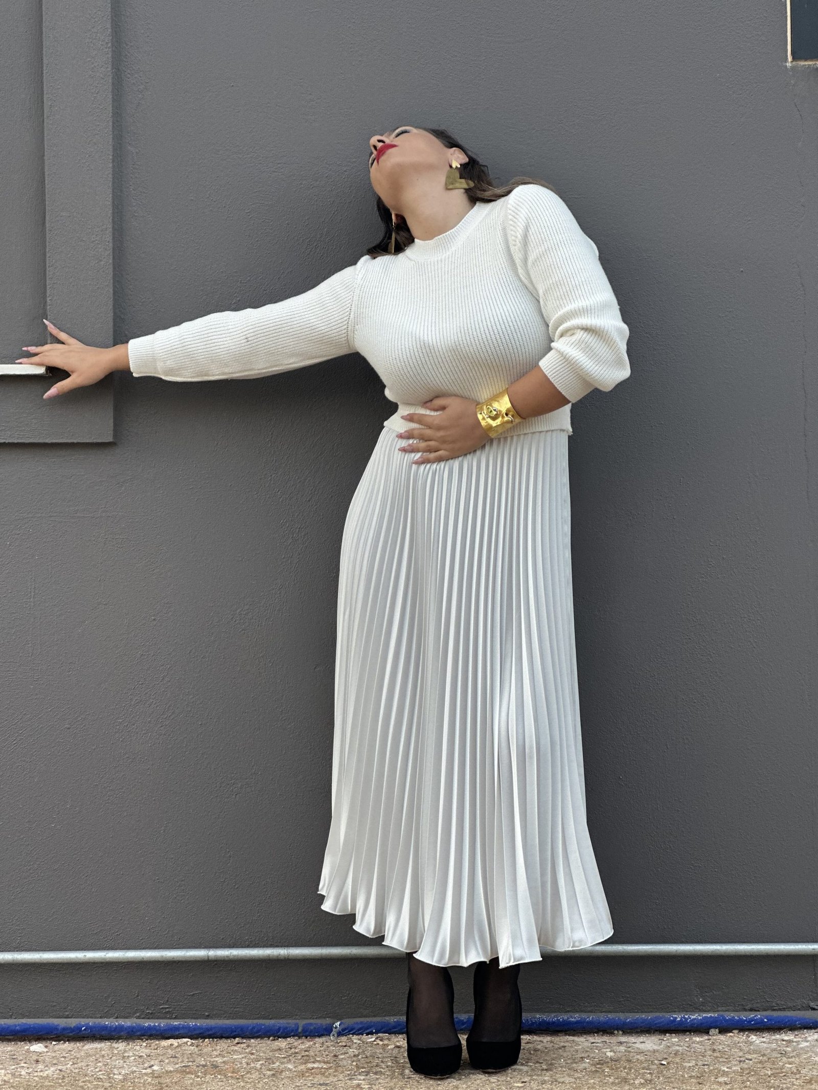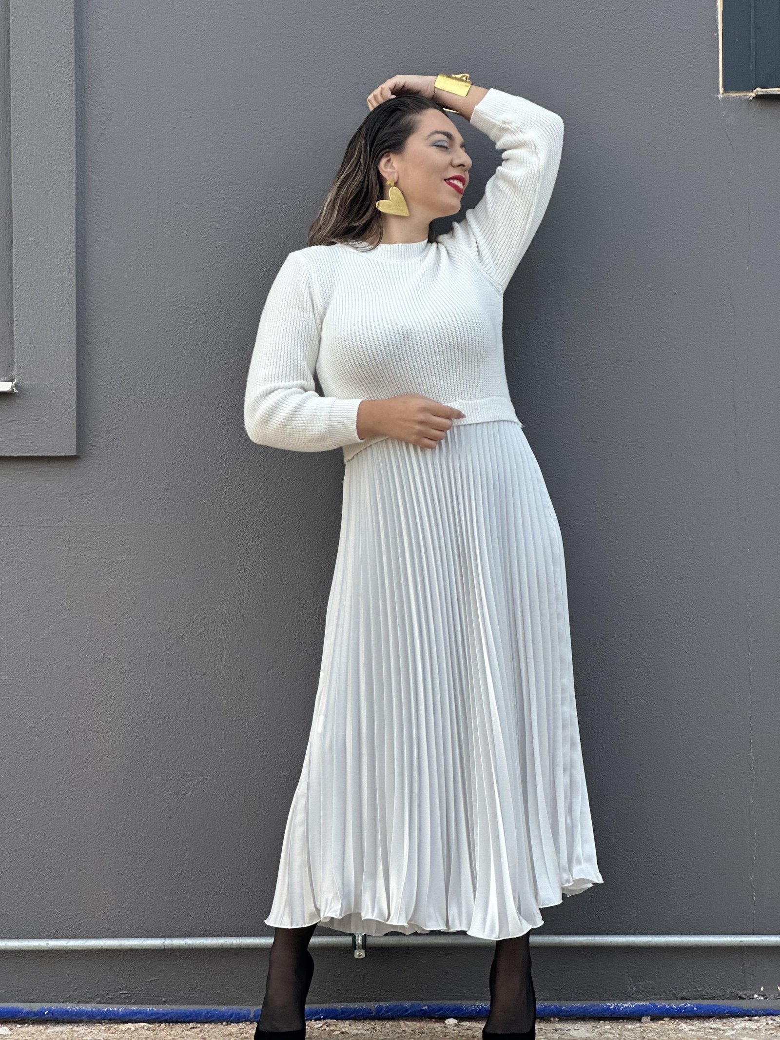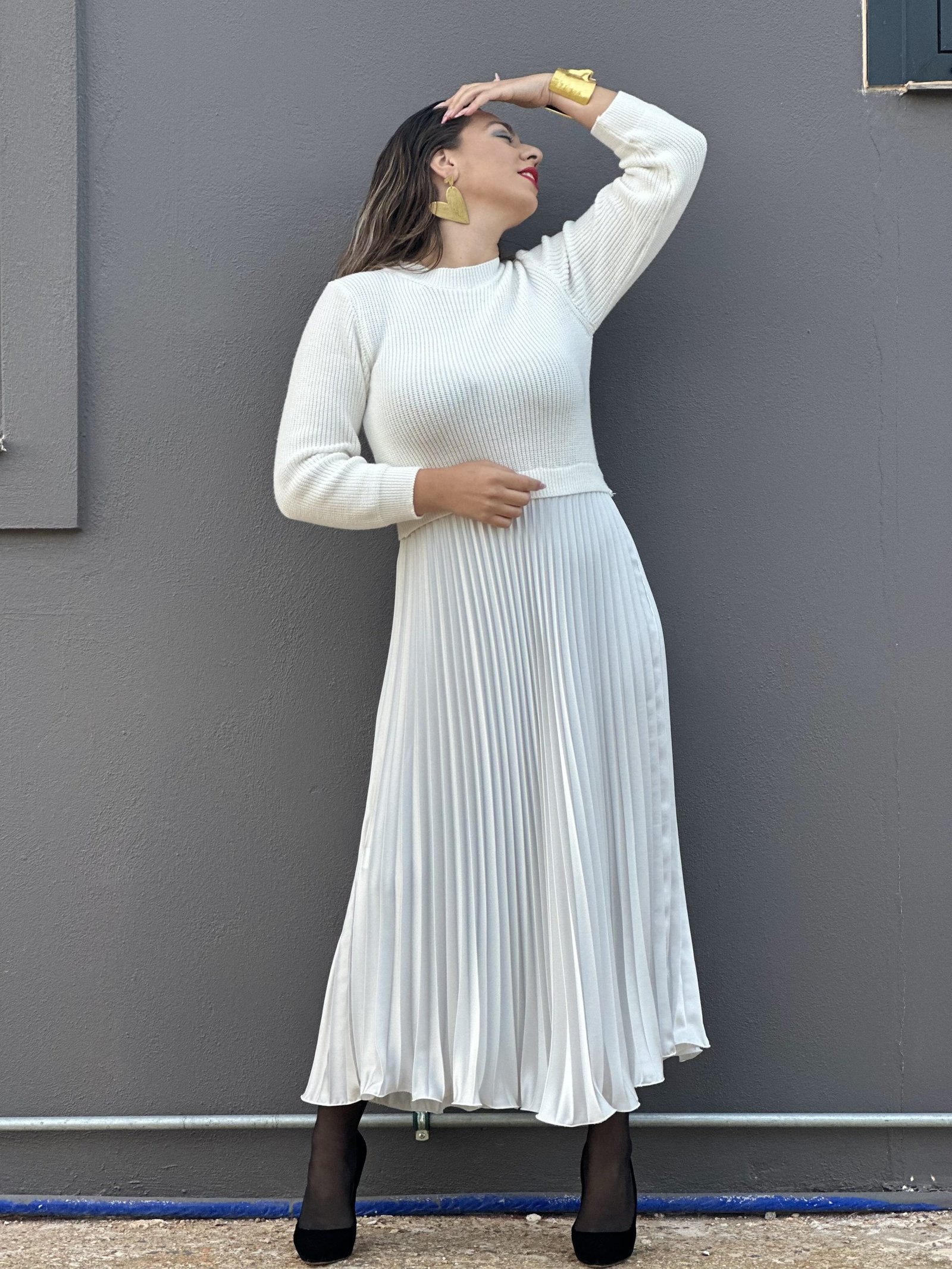 Το φόρεμα διαθέτει αέρινη γραμμή με εντυπωσιακό πλισέ τελείωμα, χαρίζοντας κίνηση και φινέτσα σε κάθε σας βήμα. Η πλεκτή μπλούζα, με απαλή υφή και μοντέρνα εφαρμογή, προσθέτει ζεστασιά και στιλιστική αρμονία, δημιουργώντας ένα chic layering effect. Ένα διαχρονικό outfit που ταιριάζει σε κάθε περίσταση, από πρωινές εμφανίσεις έως βραδινές εξόδους!