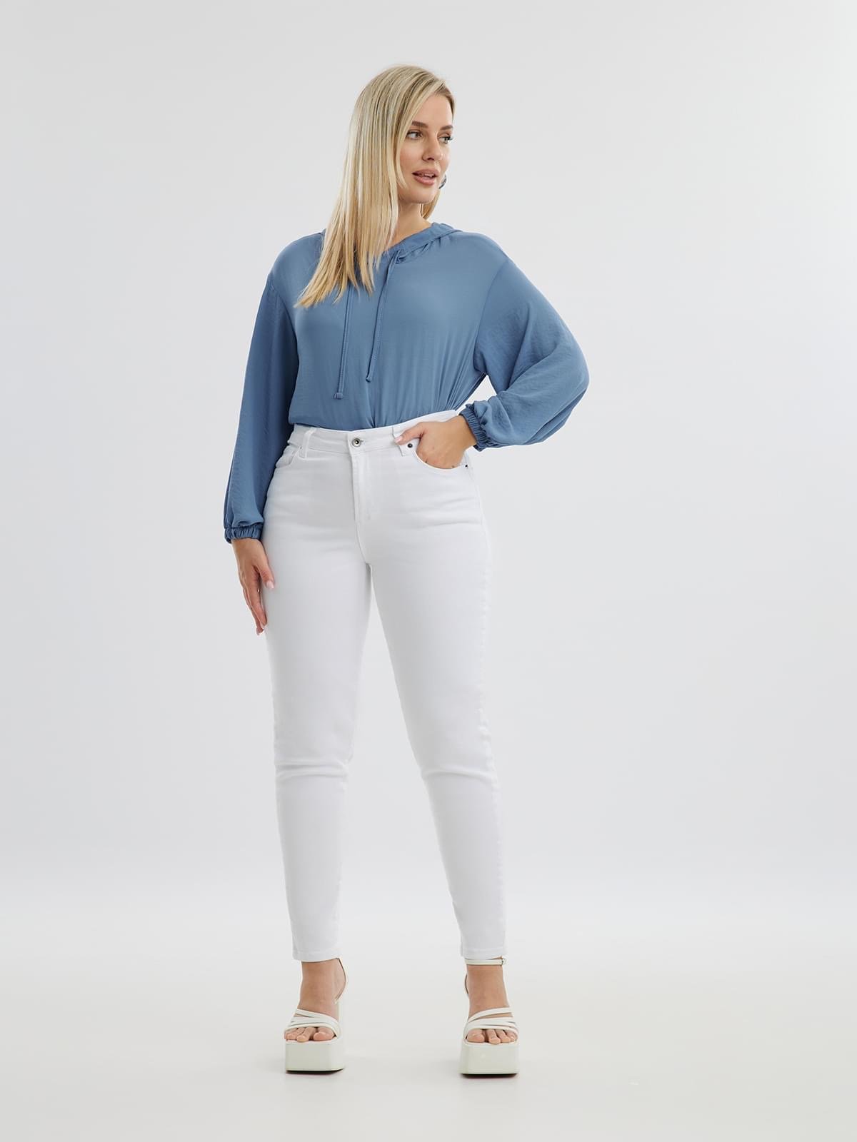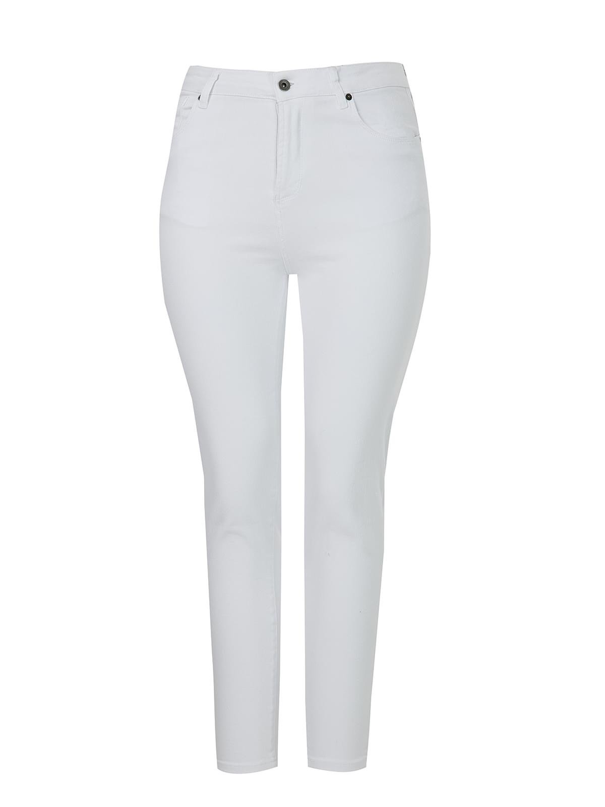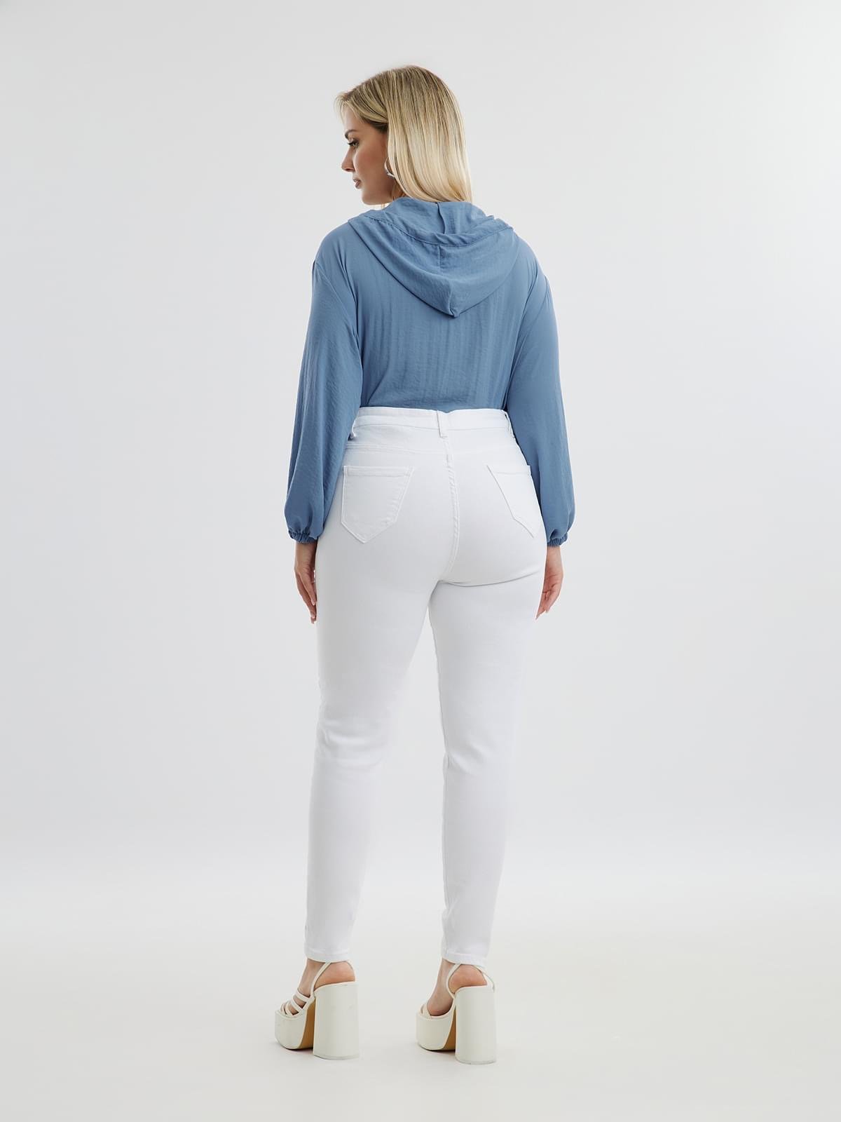 Ψηλόμεσο σωλήνας τζιν. Κλείσιμο μπροστά με μεταλλικό κουμπί και φερμουάρ.